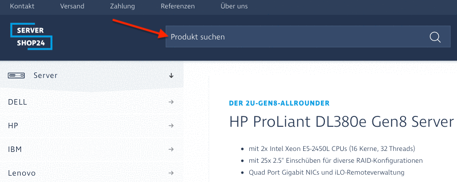 Die Suchfunktion finden Sie immer im Kopfbereich unseres Webshops. Geben Sie Suchbegriffe wie z. B. "DL380 Gen10 Server" ein oder suchen gezielt nach Artikelnummern wie z. B. "732136-001".